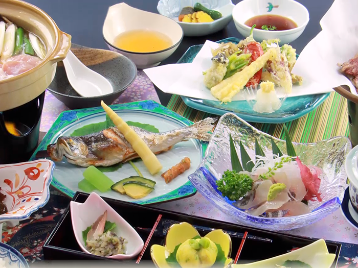 お食事は、米どころ秋田が生んだ自慢の郷土料理です。炊き立ての新米を一本一本秋田杉のクシに巻いて焼き、 地鶏、山茸、ネギ、ゴボウ、セリ、各種山菜等と 煮込み、あつあつの鍋料理としてご賞味下さい。