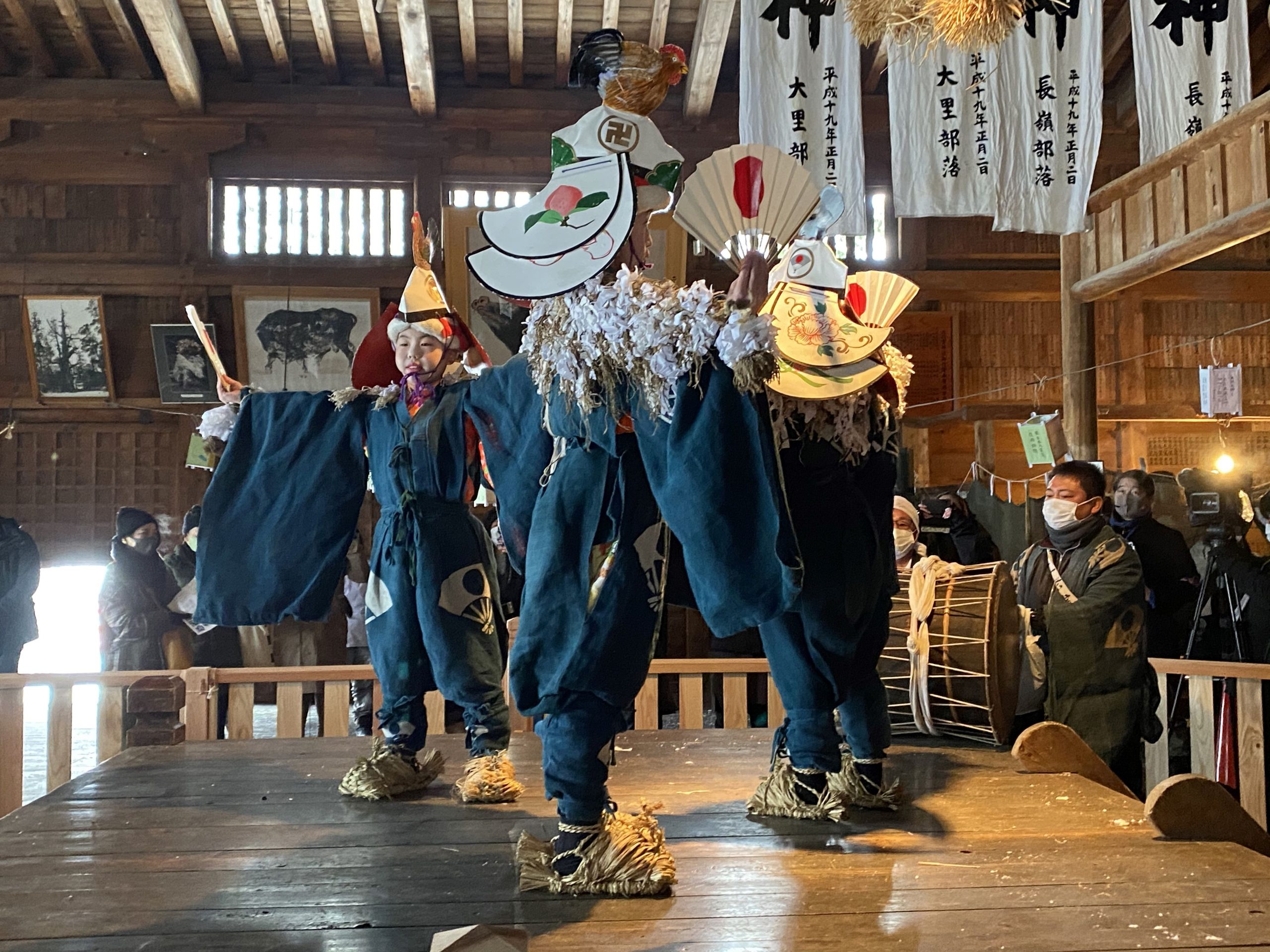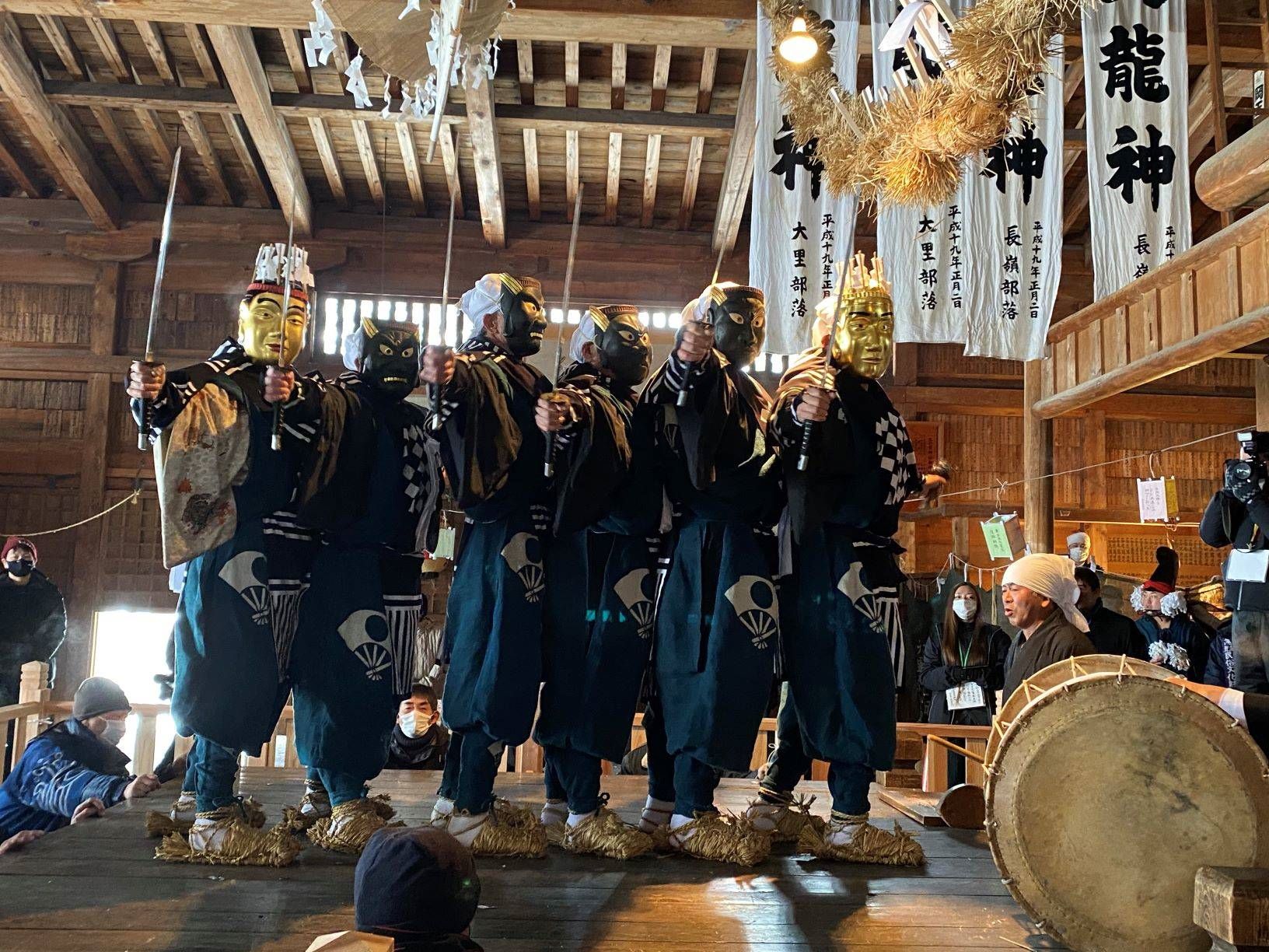 大里、小豆沢、長嶺、谷内の四集落から、能衆(舞う人たち)が集い、神社の社前と殿内で様々な舞楽を奉納します。なかでも見どころは黄金の仮面と刀が煌びやかな五大尊舞と、地元の子供たちによって奉納される鳥舞です。
